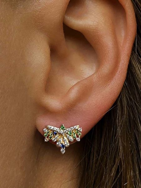 – materiał: srebro Sterling próby 925- powłoka: 18K złoto- zapięcie: motylkowe- rodzaj kamienia: cyrkonia- kolor kamienia: bezbarwny, zielony, niebieskiWskazówka: Zdjęcie produktu w powiększeniu.