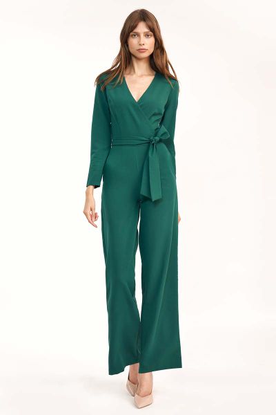 Kombinezon z Kopertowym Dekoltem Wiązany w Pasie – Zielony