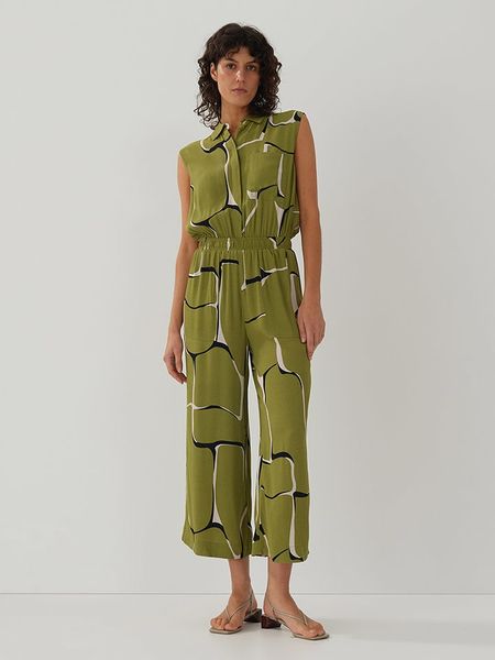 – czysta wiskoza- ramiączka: szerokie- kołnierz: kent- zapięcie: skrócona listwa guzikowa- kieszenie: na piersi- talia: elastyczna- kieszenie: wpuszczane- zakończenia nogawek: dzwony- wzór: na całości