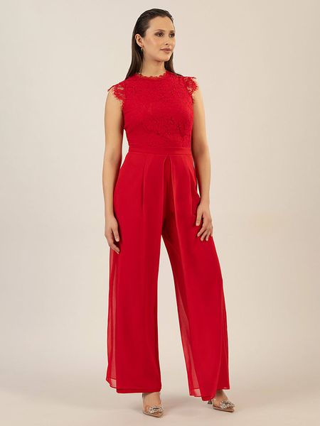 – ramiączka: szerokie- dekolt: okrągły- zapięcie: guzik na plecach- krój nogawek: Wide Leg- detale: kant, koronka- krój: taliowany- look: jednokolorowy