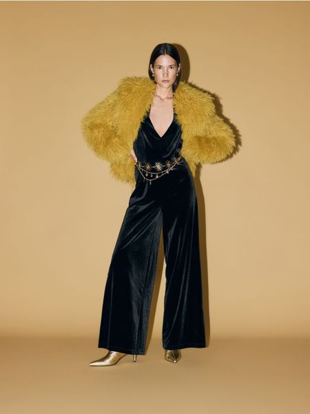 Kombinezon o swobodnym kroju, wykonany z velvetowej dzianiny.
