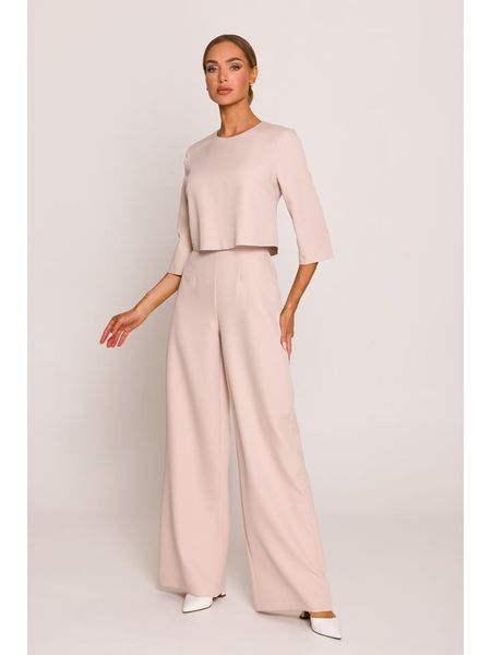 – dekolt: okrągły- zapięcie: suwak z tyłu- długość rękawa: półdługi- kieszenie: wpuszczane- zakończenia nogawek: dzwony- krój: prosty- look: jednokolorowy