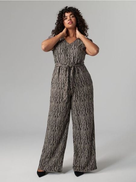 Wzorzysty kombinezon o luźnym kroju oraz dekoracyjnym wycięciem na plecach.
