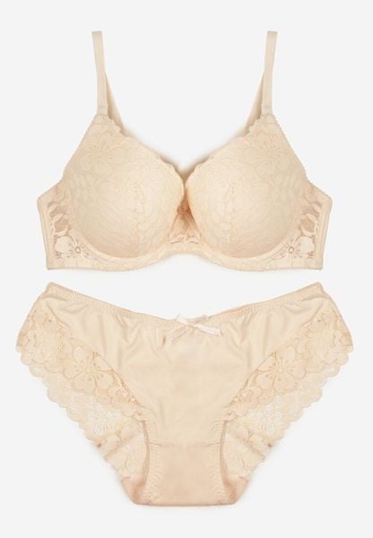 Jasnobeżowy Komplet Biustonosz i Majtki Typu Figi Ozdobiony Koronką Ezivane
