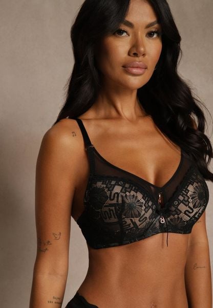 Czarno-Beżowy Biustonosz Ozdobiony Transparentnymi Wstawkami i Koronką Brannor