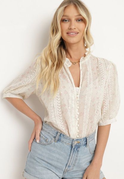 Beżowo-Różowa Koszula z Dodatkiem Bawełny Zapinana na Guziki Ozdobiona Stójką Ulosofia