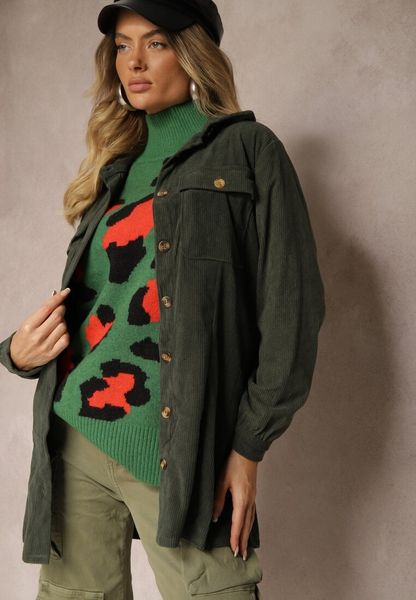 Zielona Taliowana Koszula Sztruksowa o Długim Kroju z Kieszeniami Veloriana