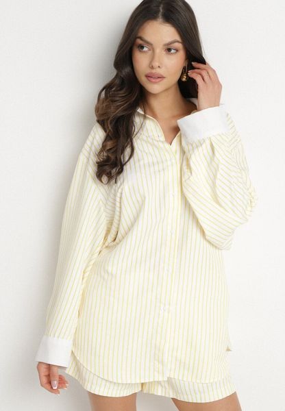 Żółta Koszula z Bawełny o Kroju Oversize w Paski z Metalicznymi Zdobieniami Pasenitia
