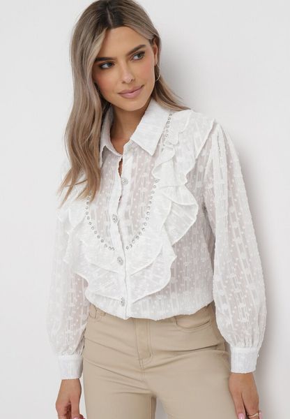 Biała Koszula Plumeti z Błyszczącą Nitką i Falbankami Banie