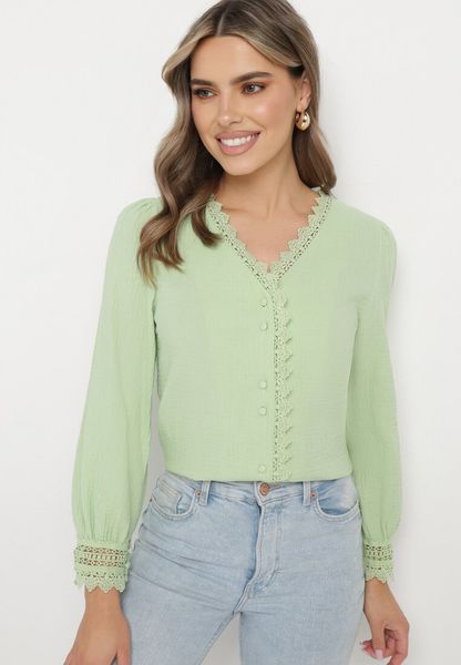 Zielona Bawełniana Koszula Zapinana na Guziki z Ozdobną Koronkową Tasiemką Raniatte