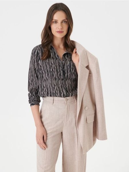 Czarno-Beżowa Wiskozowa Koszula Oversize z Długim Rękawem i Nadrukiem z Paskami Biwina