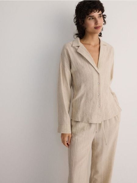 Koszula o prostym kroju, uszyta ze strukturalnej tkaniny z lnu oraz wiskozy.