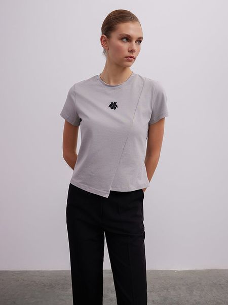– dekolt: okrągły- dolny brzeg: asymetryczny- krój: prosty- nadruk: kwiatowy- look: jednokolorowyUwaga: Przy wyborze właściwego wariantu zaleca się korzystanie z tabeli rozmiarów.