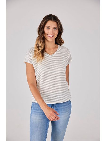– dekolt: V- detale: połyskująca nitka- krój: prosty- wzór: paski