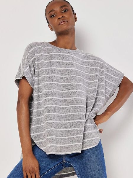 – dekolt: okrągły- krój rękawów: nietoperz- dolny brzeg: z rozcięciem- krój: luźny- wzór: paski