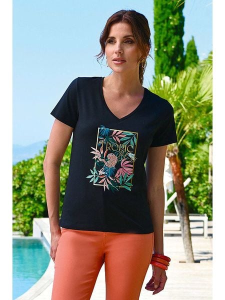 – dekolt: V- nadruk: graficzny- krój: prosty- look: jednokolorowyWskazówka: Na metkach odzieży tej marki znajdują się rozmiary francuskie. Rozmiarówka została przez nas przeliczona. Podane do wyboru warianty rozmiarów odpowiadają standardowym europejskim rozmiarom konfekcji. Prosimy zapoznać się z zamieszczonym objaśnieniem rozmiarów.