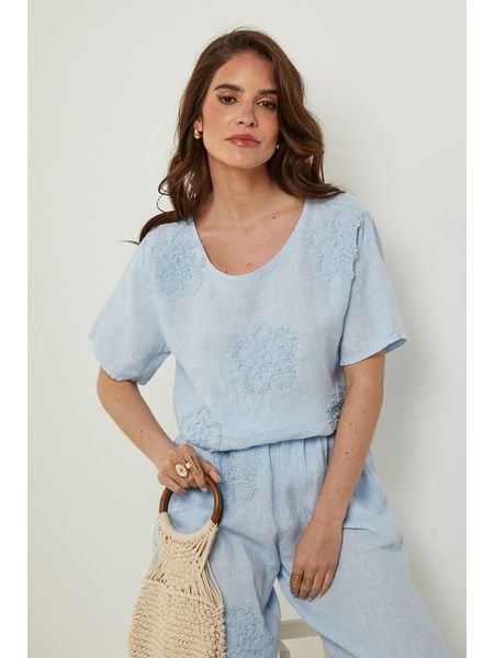 – czysty len- dekolt: okrągły- detale: haft- krój: luźny- look: jednokolorowy