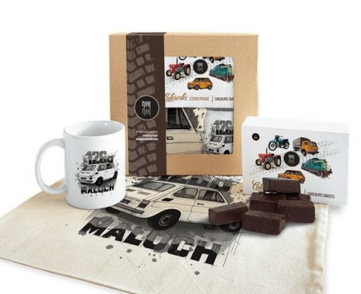 Paczka prezentowa z samochodem Mały Fiat cukierki czekoladowe 125 gkubek ceramicznytorba bawełniana Paczkę można dodatkowo powiększyć o koszulkę lub bluzę (Kliknij aby zobaczyć wymiary i specyfikacje)Samochód Fiat 126p — Maluch — Mały FiatPolski Fiat 126, nazywany z czułością „Małym Fiatem”, po raz pierwszy wyjechał z włoskiej fabryki w 1972, a niespełna rok później rozpoczęto jego produkcję w […]
