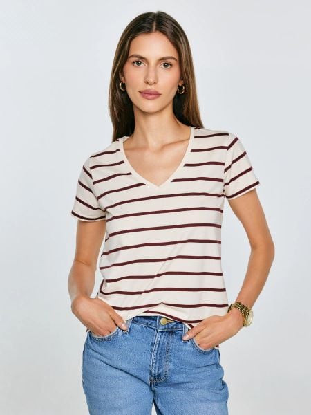 Koszulka damska z dekoltem v-neck w paski kremowa Retina 103