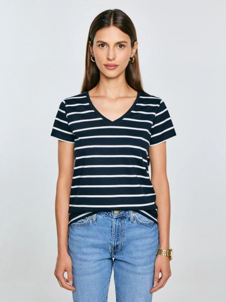 Koszulka damska z dekoltem v-neck w paski granatowa Retina 403