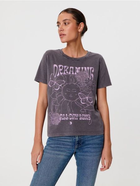 Bawełniana koszulka z nadrukiem słońca i kwiatów.
