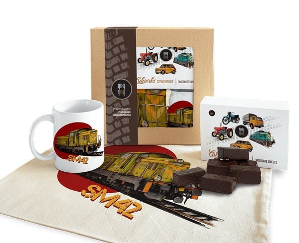 Paczka prezentowa z lokomotywą SM42 Stonka cukierki czekoladowe 125 gkubek ceramicznytorba bawełniana Paczkę można dodatkowo powiększyć o koszulkę lub bluzę (Kliknij aby zobaczyć wymiary i specyfikacje)Lokomotywa Fablok 6D SM42 StonkaAutorem rysunku jest Benio Bereś.