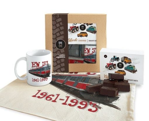 Paczka prezentowa EN57 Regio cukierki czekoladowe 125 gkubek ceramicznytorba bawełniana Paczkę można dodatkowo powiększyć o koszulkę lub bluzę (Kliknij aby zobaczyć wymiary i specyfikacje) EN57 RegioKibel, ortopeda, a może tyku-tyku? Pociąg EN57 o wielu obliczach na stałe zapisał się w kartach polskiej kolei. Kojarzą go nie tylko zapaleni kolejarze, ale także przeciętni obywatele, jeżdżący kiblem […]