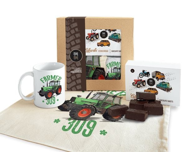 Paczka prezentowa z traktorem Fendt Farmer 309 cukierki czekoladowe 125 gkubek ceramicznytorba bawełniana Paczkę można dodatkowo powiększyć o koszulkę lub bluzę (Kliknij aby zobaczyć wymiary i specyfikacje)Ciągnik Fendt Farmer 309Autorem rysunku jest wrocławski artysta Paweł Grabowski.