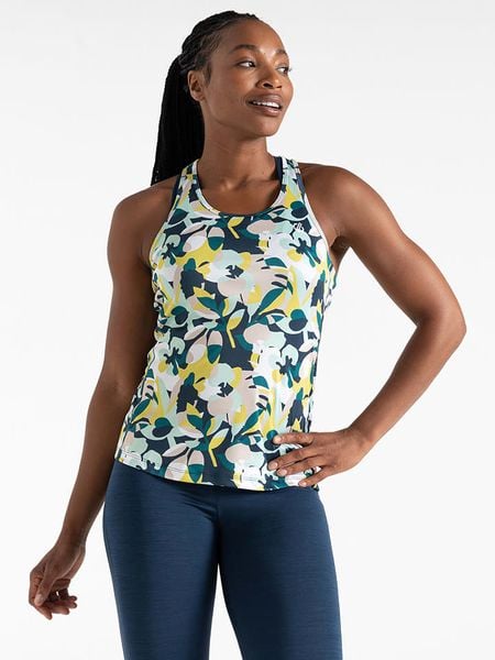 – szybkie odprowadzanie wilgoci na zewnątrz- szybkoschnący materiał- oddychalność- dekolt: okrągły- ramiączka: sportowy krój pleców- krój: prosty- wzór: kwiatowy