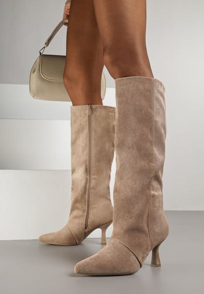 Ciemnobeżowe Kozaki z Imitacji Zamszu na Kaczuszce Zdobione Przeszyciami Anivitte