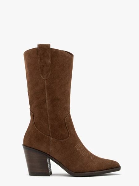 Brązowe kozaki typu kowbojki z cholewką do połowy łydki