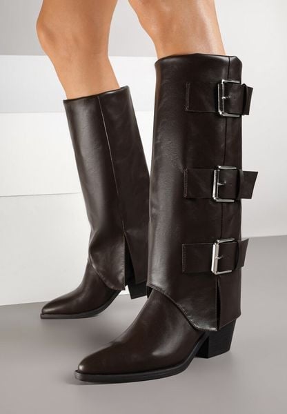 Brązowe Kozaki na Stożkowym Obcasie z Wywiniętą Cholewką Klamrami i Suwakiem Ernenta