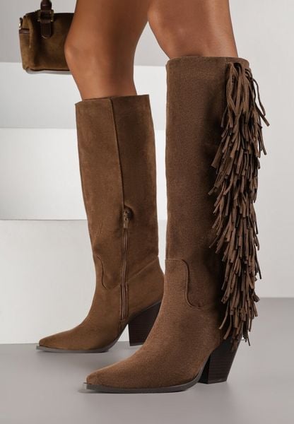 Brązowe Kozaki Kowbojki na Stożku z Imitacji Zamszu Zdobione Frędzlami Rabella