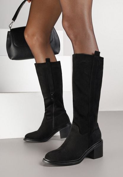 Czarne Kozaki na Słupku z Cholewką Imitującą Nogawkę z Klamerką i Suwakiem Fenneia