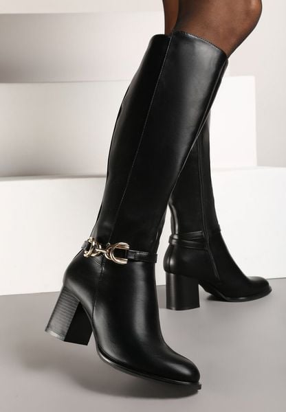 Czarne Kozaki na Słupkowym Obcasie Zdobione Metalową Aplikacją przy Cholewce Resiona