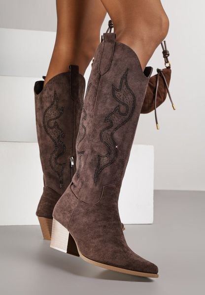 Brązowe Kozaki Kowbojki na Stożku z Cholewką z Cyrkoniami Nalikka