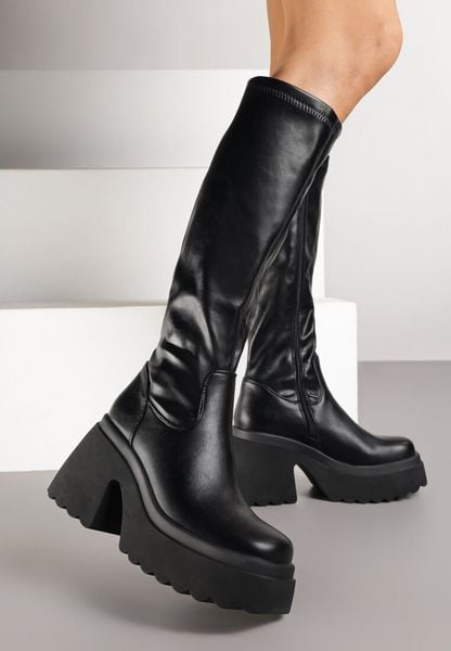 Czarne Casualowe Kozaki na Platformie i Koturnie z Ekoskóry z Dopasowaną Cholewką Erissia
