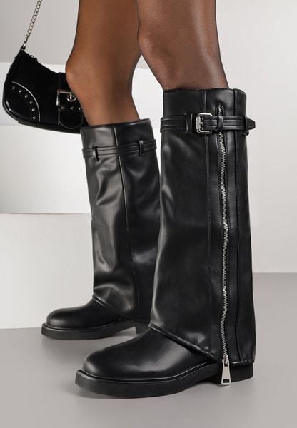Czarne Kozaki w Stylu Bikerów z Wywiniętą Cholewką Suwakiem i Klamrą Siriselle