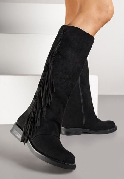 Czarne Kozaki w Stylu Boho z Imitacji Zamszu z Frędzlami Vemirina