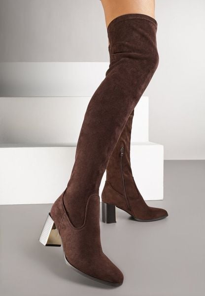 Brązowe Długie Kozaki za Kolano z Imitacji Zamszu na Metalicznym Obcasie Terephne