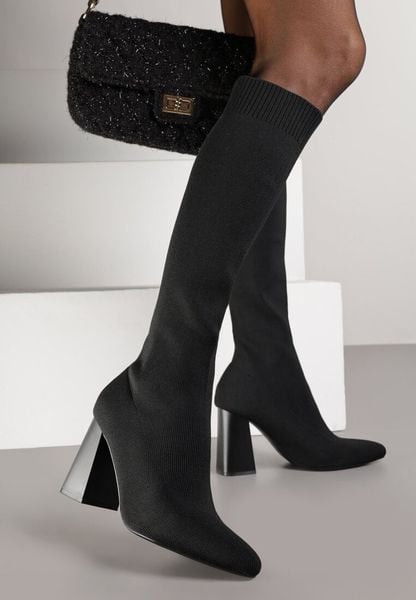 Czarne Kozaki do Kolana VICES ze Skarpetkową Cholewką i Metalicznym Słupkiem Reallesa