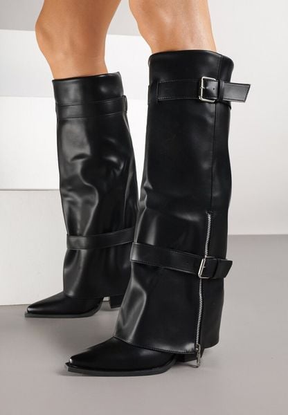 Czarne Kozaki na Stożkowym Obcasie z Wywiniętą Cholewką Klamrami i Suwakiem Ernenta
