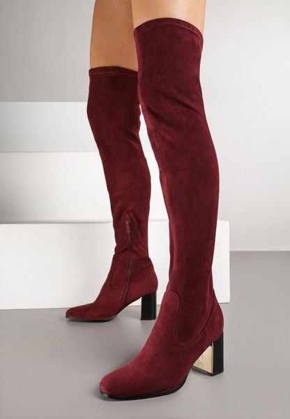 Bordowe Długie Kozaki za Kolano z Imitacji Zamszu na Metalicznym Obcasie Terephne