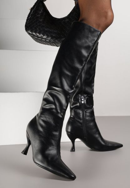 Czarne Marszczone Kozaki Vices na Obcasie Typu Kaczuszka Miomadia