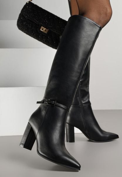 Czarne Kozaki na Słupku ze Szpiczastym Noskiem i Paskiem z Klamrą Luvitte
