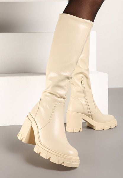 Beżowe Kozaki na Obcasie z Dopasowaną Cholewką Avanette