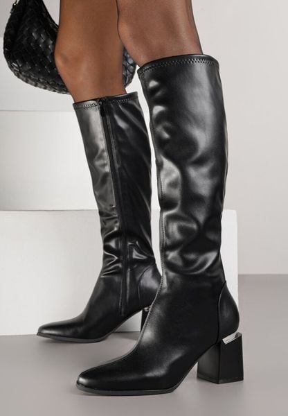 Czarne Dopasowane Kozaki Vices na Geometrycznym Metalicznym Słupku z Noskiem w Szpic Nettania