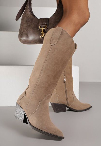 Ciemnobeżowe Zamszowe Kozaki Kowbojki na Stożkowym Obcasie Sevra