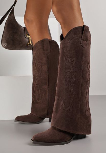 Brązowe Kozaki Kowbojki na Stożku z Haftowaną Cholewką Imitującą Nogawkę Fenika