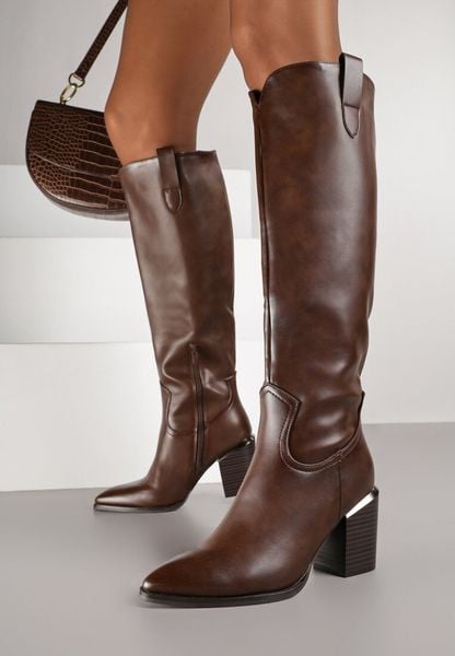 Ciemnobrązowe Kozaki na Obcasie z Metaliczną Aplikacją Rielva